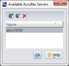 The Available AccuRev Servers dialog provides a way to maintain the list of AccuRev Servers to which you can login. Each client installation of AccuRev maintains its own AccuRev Server list, in file <AccuRev-install-dir>/bin/acclient.cnf.