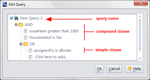 Whether you're composing a new query or revising an existing one, you end by saving your work (Ok button) or discarding it (