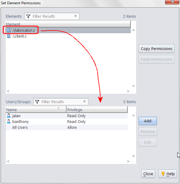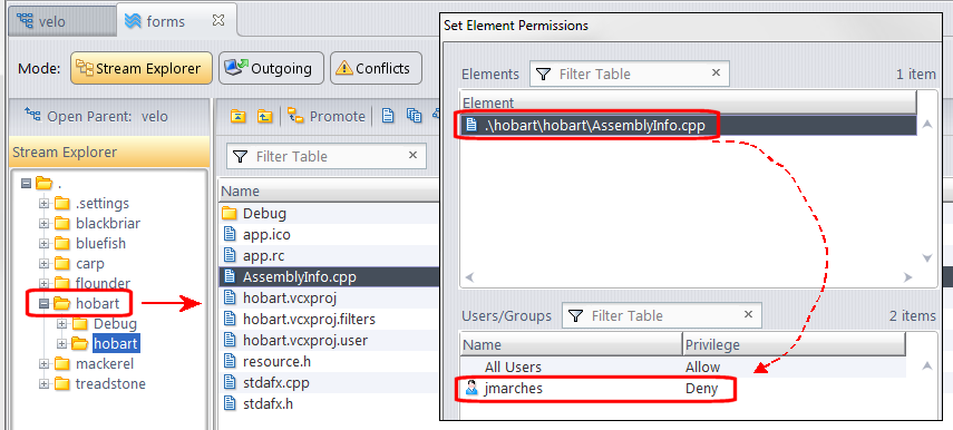 2. Right-click one of the selected files and choose Permissions... from the shortcut menu.Alternatives: Use the Ctrl+E accelerator key, or choose Actions > Permissions... from the main menu.Tip: You can select only one element at a time.Note: The "All Users" name means just that -- all users and groups defined in the depot. Exceptions (like users banthony and jalan) are called out separately. In this example, all users have Allow privileges for forms.xml, except users banthony and jalan, who have Read Only access for that element.