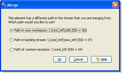 • Move: Relocating the element to another directory in the depot::... to be change to the parent directory element, but not a change to the file elements within it. (This change to the parent directory has the side-effect of changing the pathnames of all elements below it.)If your colleague promotes his change first, then the file will get (overlap) status in your workspace. Before you can promote the file, you must use the Merge command to resolve the namespace conflict.