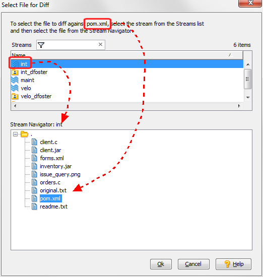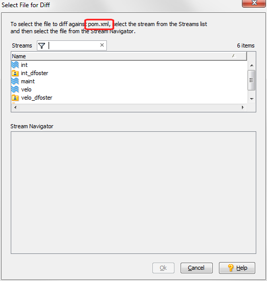 If the file you chose for the Diff operation exists in the selected target stream, AccuRev automatically highlights the file in the Stream Navigator pane. You can choose a different file for the