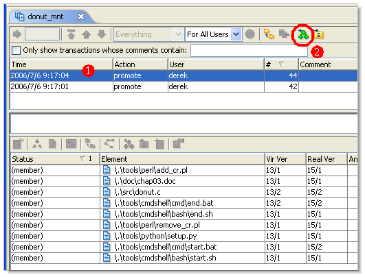 3. A History Browser tab shows all the transactions that created (via Promote) versions in a stream. An Active Transactions tab shows the subset of these transactions with at least one version still active in the stream. In either one, you can load a Change Palette with the versions created one or more selected transactions.