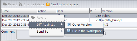Controls at the top of the Summary pane determine which transactions are displayed. You can invoke commands on one or more transactions that you select. See Working with Tables on page 14.Once a certain set of transactions has been loaded into the summary pane, you can browse through those transactions. Click any transaction to select it; the Comment and Versions panes are updated with the transaction's details. You can use the usual navigation keys to change the selected transaction: up-arrow and down-arrow, PgUp and PgDn, Ctrl-PgUp and Ctrl-PgDn.The preceding controls affect the contents of the Summary pane --what transactions are displayed, how many, in what order, and so on. The show current change package check box, which appears on the far right side of the display controls, can affect the information that is displayed in the Versions pane.When the show current change package checkbox is selected (the default setting), the Versions pane reflects the change package contents at the current time. In the following illustration, you can see that the version created with transaction #101 does not appear to be associated with a change package:If you are inspecting a version and do not see an associated change package where you expect, it might indicate that the version was removed from the change package after it was promoted --that is, it is not currently associated with the change package. Clearing the show current change package check box will show you the associated change package association as it was at the time the version was created:(from dynamic stream history only) For the selected Promote transaction, performs the equivalent of an "undo" in a particular child workspace of the dynamic stream. AccuRev prompts you to specify which workspace. Older versions of the transaction's elements will be activated in that workspace. For details, see the revert reference page in the AccuRev CLI User's Guide.(dynamic stream only) Load the selected versions into the Change Palette, so that they can be merged and promoted to other streams.(dynamic stream only) Load the selected versions into the Change Palette, so that they can be patched to other streams.History Browser / Summary Pane Controls
