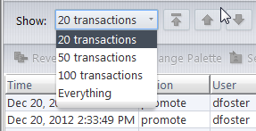 Manage Groups of TransactionsTo change this count, use the Transaction Count list box. (Each time you change the count, the browser returns to displaying the most recent transactions.) Selecting Everything loads all the relevant transactions into the summary pane.
