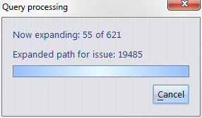 • The Expanded path for issue: field identifies the last issue number (or third-party key) that has been expanded.Processing a substantial number of subtask issues can take a long time. You can click Cancel at any time to stop the subtask issue path-expansion processing. AccuRev will display expanded paths for any issues it has processed at that time, and you can manually expand the paths for any remaining issues if you choose. Cancelling this processing does not affect the result set in any way.