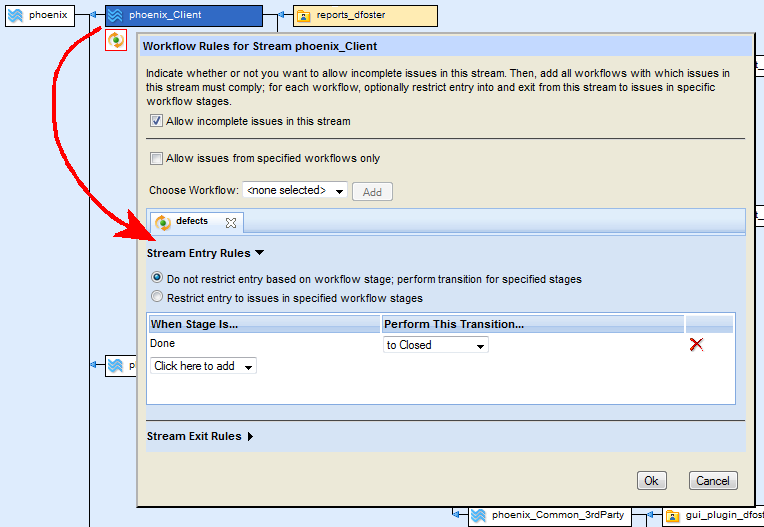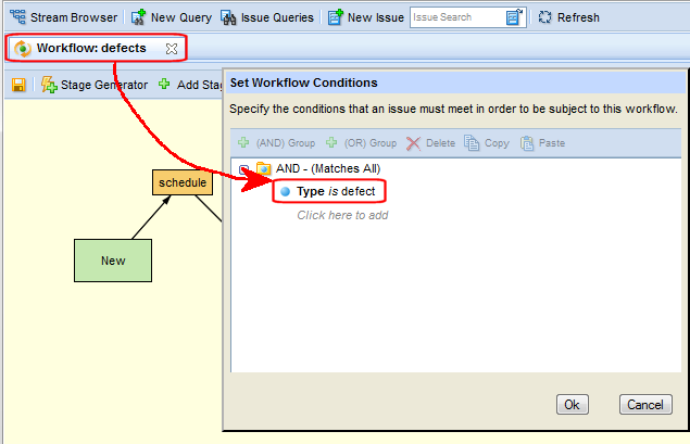Part of creating a workflow includes specifying one or more conditions that an issue must meet in order to be subject to that workflow. For example, if you want to use a workflow to manage defects in your system, you might name that workflow "defects" and create the condition for that workflow as Issue Type = defect. By specifying the condition