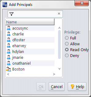4. Click the Add button.Note that the list does not include any principals for whom privileges have already been defined for the selected elements. In this example, users banthony and jalan do not appear because privileges have already been set for them for the selected element. (Use the Edit action to change existing privileges. See Editing Permissions for more information.)Note: Changes that you make to permissions take effect as soon as you click the Ok button in the Add Principals dialog box.