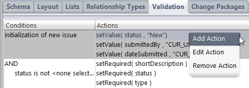 The setting of initial field values is an unconditional validation: it happens every time a New Issue command is invoked. All other validations are conditional: a certain set of actions are performed if, and only if, a certain condition is met.