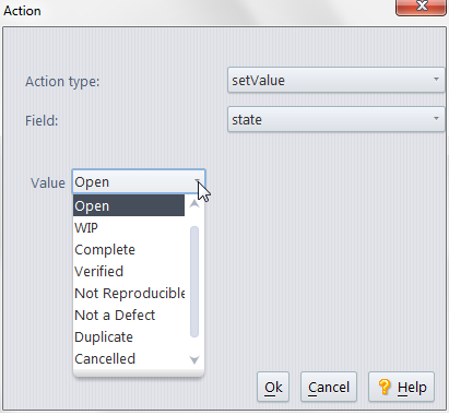 The Value edit-widget adjusts to the selected field, just as it does when you're initializing a field in a new issue record.