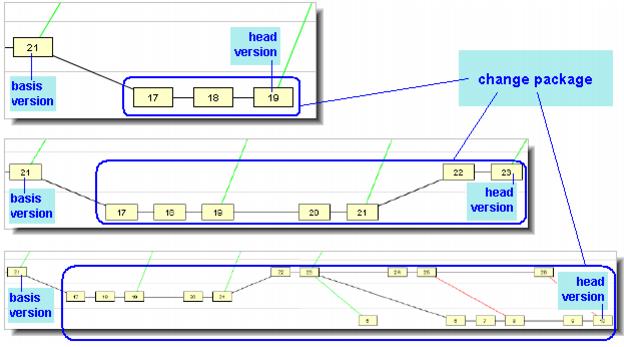 A change package entry for an element consists of the element’s entire version graph up to the specified head version, minus the entire version graph up to the specified basis version. For these purposes, the version graph includes direct predecessor-successor connections and merge connections, but not patch connections.
