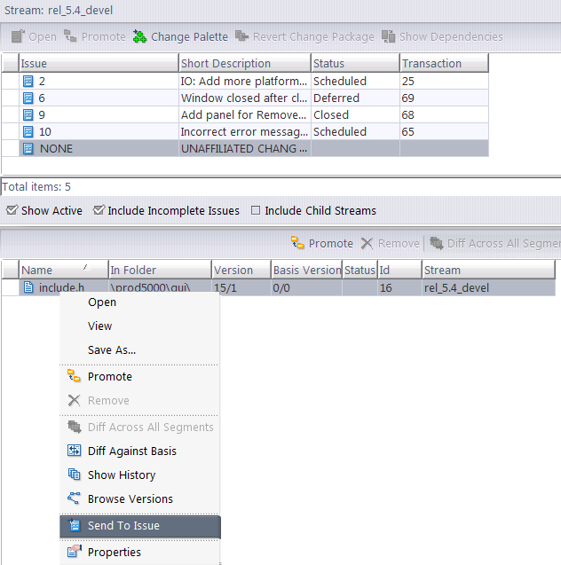 From the resulting display, you can right-click the unaffiliated elements, explore their history, and then take appropriate actions to correct their unaffiliated status. For example, you can use Send to Issue and then promote, or promote the files to an issue while promoting from this stream to its parent.