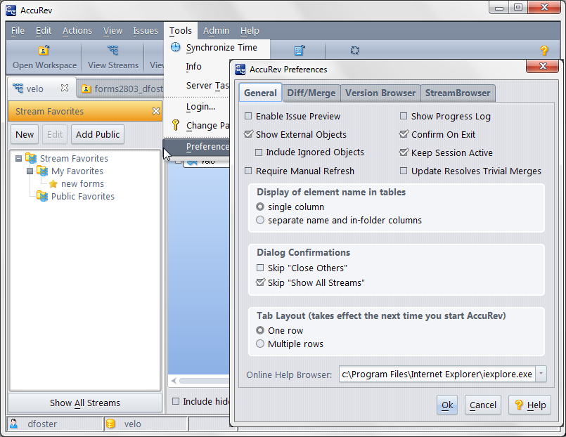 In the GUI, click Tools > Preferences and enter the full pathname of the browser in the Online Help Browser field on the General tab:Or, use the setpref command from the CLI. For example:Either method updates the AC_BROWSER setting in preferences.xml in the .accurev subdirectory of the user’s home directory.