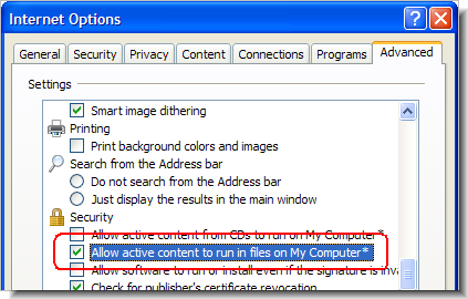 3. Scroll down to the Security settings, and ensure that Allow active content to run in files on My Computer is checked.Recent Chrome browsers have introduced a new security model which by default prevents them from working with Javascript-based web content residing on a local file system rather than on a server (see http://code.google.com/p/chromium/issues/detail?id=47416). This has caused several companies’ help systems to stop working with these browsers.