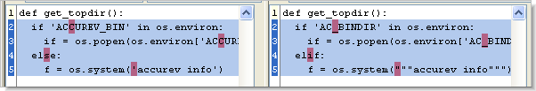 • Changed Section (blue background): Sometimes, the Diff tool decides that a text section in the "before" version has been revised, producing the corresponding section in the "after" version. The before and after sections are not necessarily the same length, in which case some empty space is displayed in one of the versions. Both the before and after sections appear with a blue background. Both sections contain red character highlights, indicating the first location in a line where the two versions differ: