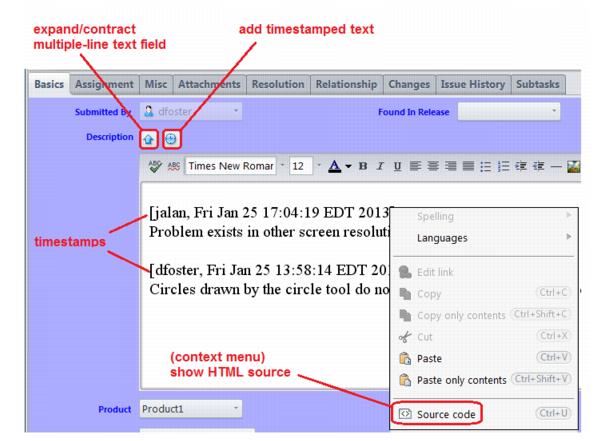 3. Click the Hide Source button to revert to the rich text display.Rich text support is available for fields with a data type of either Text or Log and is enabled on a per-field basis. See Enabling Rich Text for Text and Log Fields for more information.A timespan field is AccuWork's only numeric field type. A timespan field can be configured in the schema editor to be either calculated or editable. A calculated timespan field is read-only, and its value is the difference between two timestamp fields that are associated with the timespan field in the schema definition.You can type a value into an editable timespan field; only non-negative numbers and decimals are valid. If you enter an integer (e.g., 45), it is automatically converted to a decimal (45.0).