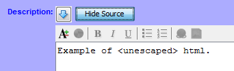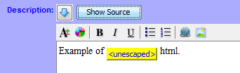 Show Source button Displays the HTML source for formatted text. When clicked, the button text changes to Hide Source. Clicking the Hide Source button reverts the display to formatted text only.