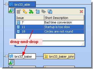 • Drag-and-dropping the issue record(s) onto another stream or workspace in the Stream Browser display. The destination can be the parent (backing) stream, another dynamic stream, or one of your workspaces. This invokes a Promote or Send to Workspace operation on all the elements in the selected issue record(s).You can also drag-and-drop the subwindow control to another stream. This performs the Promote or Send to Workspace operation on all the issue records in the subwindow (even if only some of them are currently selected).Note: in the remainder of this technical note, we shorten the term “issue record” to “issue”.Note: if Promote fails with a “merge required” error, you must perform a merge for one or more elements in the source workspace (or a workspace below the source stream). When promoting the merged version(s), assign them to the same issues as the original version(s).In this scenario, your intention is the same as in the preceding one — to cross-promote the versions in one or more issues from one dynamic stream to another. Before proceeding, please see the definition of the following terms in the AccuRev Glossary chapter of the AccuRev Concepts Manual: direct, indirect, incomplete, cyclical, and coalesce.You start the same way, with a drag-and-drop operation from stream brs34_able to stream brs34_baker:
