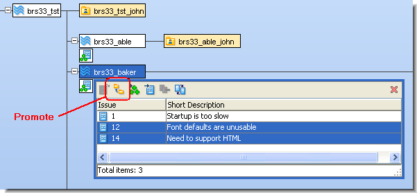 • Invoking Promote from the subwindow’s toolbar or the context menu of the issue(s).