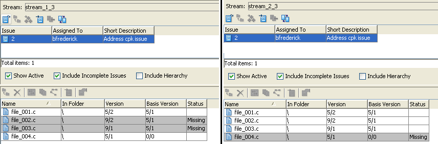 Now the change package is incomplete in both streams: the modified versions of file_002.c and file_003.c are not available under Stream 1, nor does the new file_004.c exist under Stream 2. If you do a Show Active Issues in both of the parent streams, you see two different incomplete change packages, each missing different files.