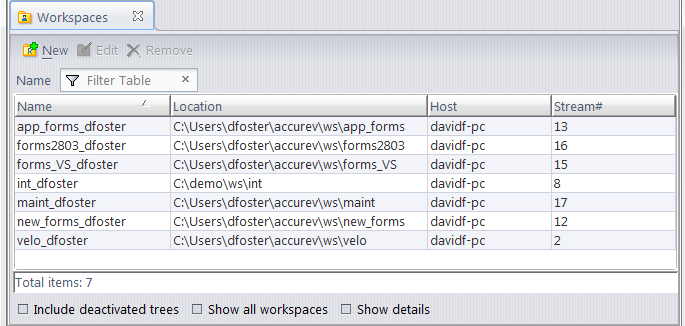 Tip: The results of the Filter Table field are temporary -- AccuRev lets you filter tables independently, from view to view. If you prefer, you can prevent AccuRev from displaying files based on an ignore patterns that you specify. You might want to exclude from view all backup and temporary files, for example. See