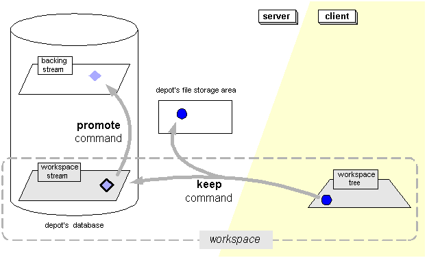 The keep command creates a new version in the workspace stream. Think of keep as moving data from the client side to the server side. This command also copies the file in your workspace tree to the depot’s file storage area. That version is visible only to your workspace.
