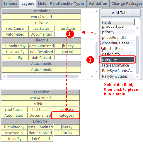 The Fields list-box offers all fields that do not currently appear in the Issue form. Click to select a field in this list-box. Then, click at the empty location on the canvas where you want to place the field.