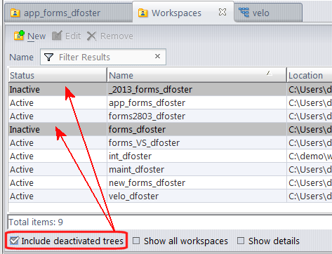 (appears if Include deactivated trees is checked) Active indicates that the workspace is available for use. Inactive indicates that the workspace is currently deactivated. Inactive workspaces can be reactivated. See the Remove and Reactivate commands below.