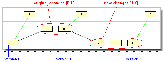In this case, it’s clear that the two series of changes can be viewed a single, uninterrupted series — starting at version B and ending with version X. That is: