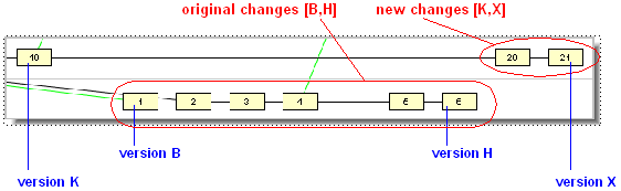 Case 1: [B,H] + [H,X] — This simple case typically arises when you think you’re done with a task and record your work as change package entry [B,H] — but it turns out that more work on the same element is required. So if you (or a colleague) start where you left off, with version H, and make changes up to version X. Then, you want to incorporate the new set of changes [H,X] into the same change package.