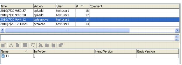 This brings up a list of all changes that have been made to the change package, including promotions, and elements that have been added (cpkadd) or removed (cpkremove).