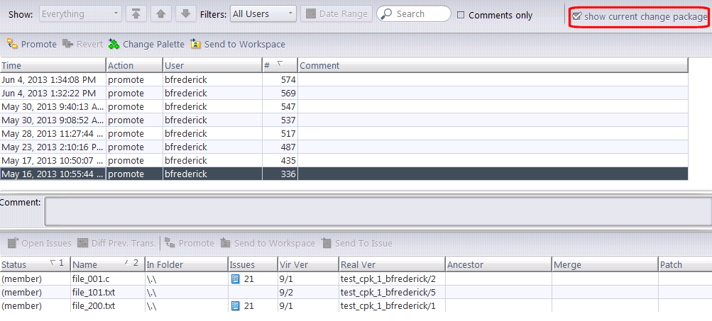 However, what if file_200.txt was removed from Issue #21’s change package at some point after the selected transaction? With the show current change package checkbox selected, Issue #21 disappears from the Issues column of file_200.txt in the lower pane.
