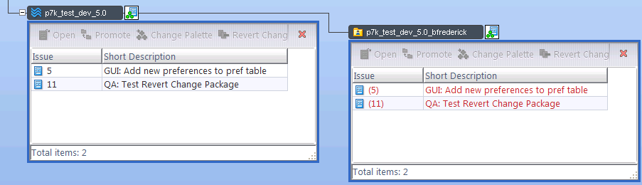 After you have reverted a change package, the issue remains active in the stream until you promote the changes you performed in the workspace. A special variant of the issue appears in red in the workspace Active Issue display, as shown in the following example. (The image has been modified to show both Active Issue displays simultaneously.)