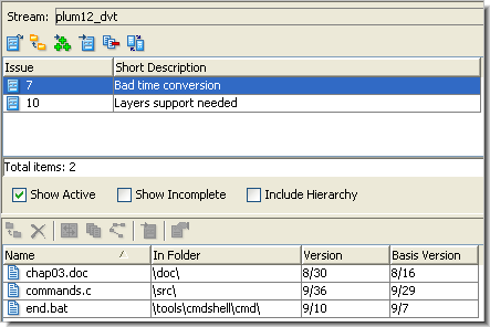 If cleared, the listing includes only issues that are completely in the stream, where “completely in” means that for every change package entry, the head version (Version column) itself is in the stream, or one of its descendants is in the stream.