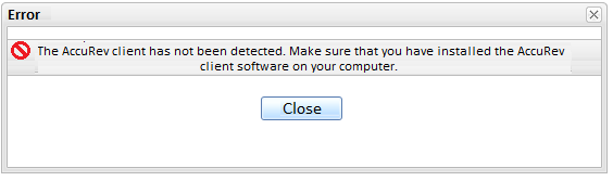 • Example: http://localhost:8085/accusync/Tip: Default configurations are installed for every ITS that AccuSync supports. You might see a different set of default configurations than those shown here.If you see this error, verify that the AccuSync server is running. If necessary, restart the AccuSync server and try starting the AccuSync Management Console again. See Appendix F: AccuSync™ Services for more information.If the AccuRev client has not been installed or if AccuSync cannot find the accurev.exe file in the path you provided in the connection configuration, AccuSync displays an error message like the following:AccuRev 6.1 introduced support for the Secure Sockets Layer (SSL) protocol to provide encrypted communication between AccuRev clients and the AccuRev server. If you are using AccuRev 6.1 or higher and SSL has been enabled on the AccuRev server, you will be unable to connect to the AccuRev server until you accept the SSL certificate. See “Post-Installation Procedures” in the AccuSync Installation and Release Notes for more information.Stopping the AccuSync™ Management Console