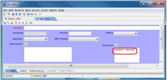 If the user enters a version in JIRA that does not exist in AccuWork, that version will not be shown when the issue is displayed in AccuWork. However, that version will appear in the .xml file (if the accurev XML command is used to get the issue).