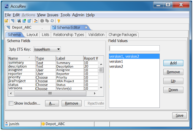 The versions field can be defined as Choose or Text type. If the version is a combination of more than one version, the combination should be set up as comma separated in the AccuWork schema as shown in the following example.