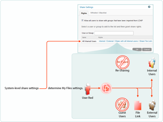 Administrators can disable sharing of files and folders in My Files on an individual user basis.