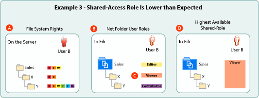 Because the Editor shared-access role is the minimum shared-access role in the Net Folder (letter B), User A can only assign the Editor shared access role when sharing the Net Folder and share recipients could only exercise Editor-level rights in folders X and Y.