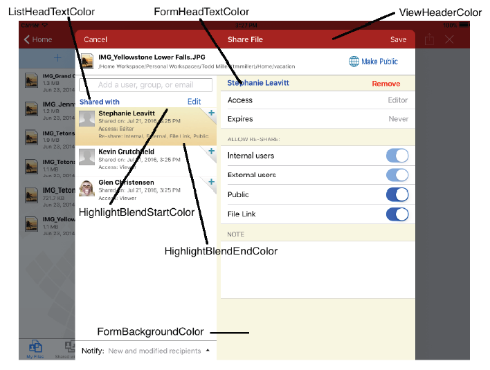 To apply custom branding to the iOS client, you create the image files for the dialogs you want to brand and define banner and other colors, as follows: