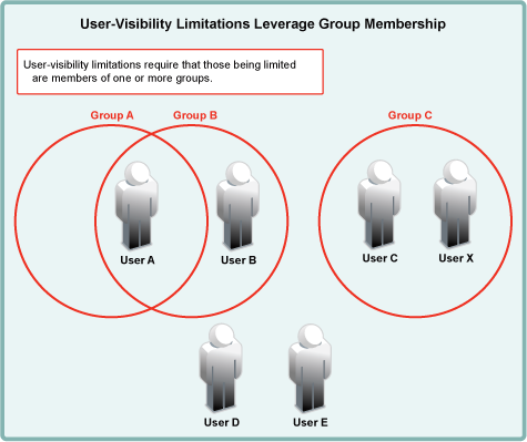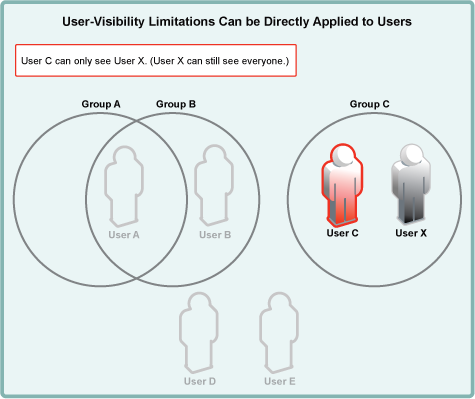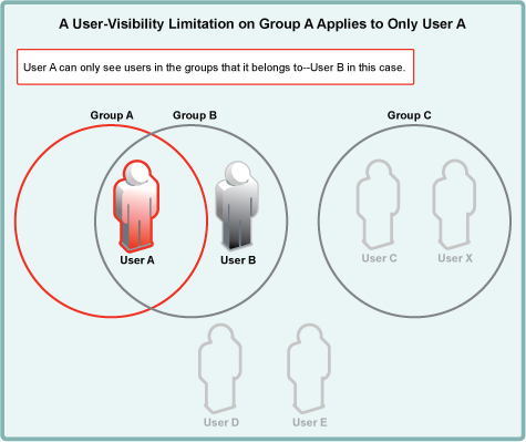 For example, after a user-visibility limitation is applied to Group A, User A can only see User B. (User B’s ability to see other users is not affected because User B is not in Group A.)