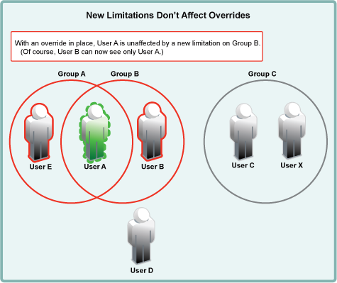 Applying new user-visibility limitations doesn’t affect overrides. User B is now restricted, but User A can still see all other users.