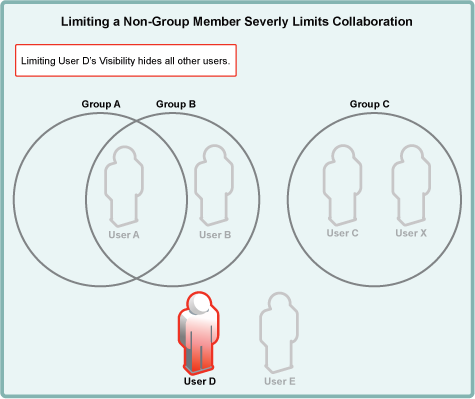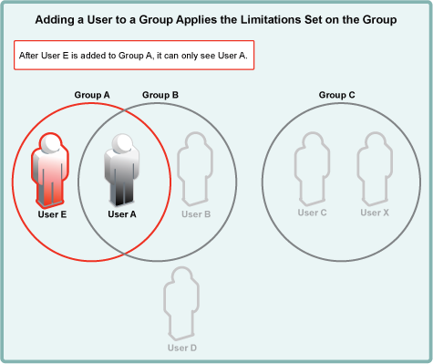 For example, if User E is added to Group A, its user-visibility is immediately limited to seeing only User A.