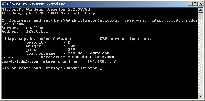 nslookup -query=any _ldap._tcp.dc._msdcs.<AD domain name> For example: # nslookup -query=any _ldap._tcp.dc._msdcs.win2003ad.com Server: 192.168.1.10 Address: 192.168.1.10#53 Non-authoritative answer: ldap._tcp.dc._msdcs.win2003ad.com service = 0 100 389 osg-dtsrv22. win2003ad.com. Authoritative answers can be found from: osg-dt-srv22.win2003ad.com internet address = 192.168.1.20