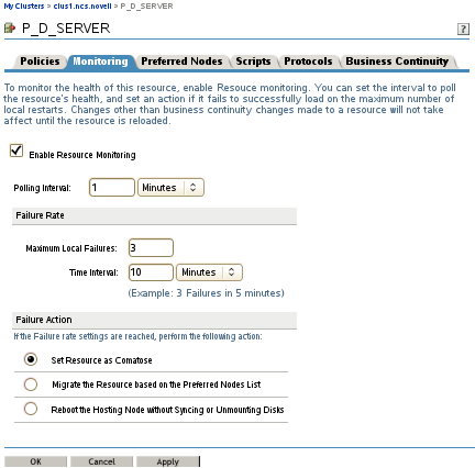 After the conversion is finalized, you can use the Clusters plug-in for Novell iManager to enable monitoring independently for each cluster resource. On the Monitoring page (as shown in Figure 3-1) in the resource properties, you must specify a polling interval, a failure rate, a failure action, and a timeout value. These settings control how error conditions are resolved for the resource.