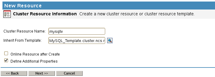 On the New Resource > Cluster Resource Information page, specify a cluster resource name, browse to select the MySQL_Template, then click Next.