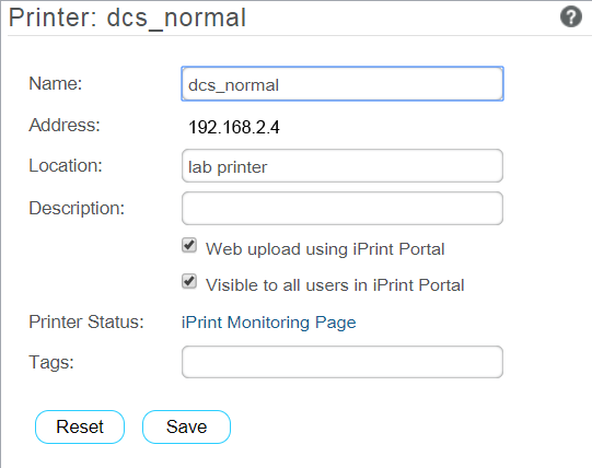 Tags: Specify a label for the printer. Multiple printers can be grouped under same label. In the iPrint Portal, it will be easier for the users to find a specific set of printers. For example, if you specify a tag as Color Printer. In the iPrint Portal, a user can easily locate specific printers by selecting the Color Printer tag.
