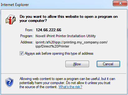 On some versions of Internet Explorer, if you are prompted with an Internet Explorer warning message do you want to allow this website to open a program on your computer? message, click Allow.