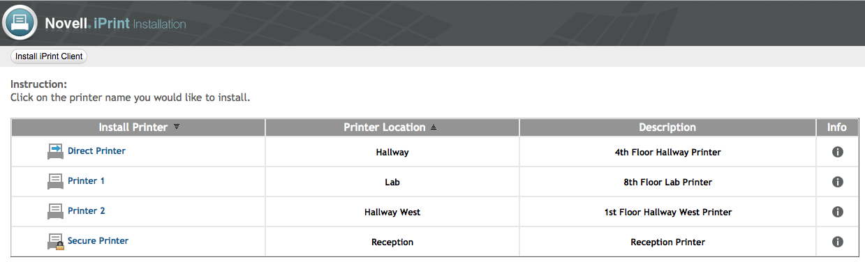 iPrint generates a list of printers associated with a Print Manager that can be used to install the iPrint Client, install an OES iPrint printer, or check the status and configuration of a printer and a list of print jobs.