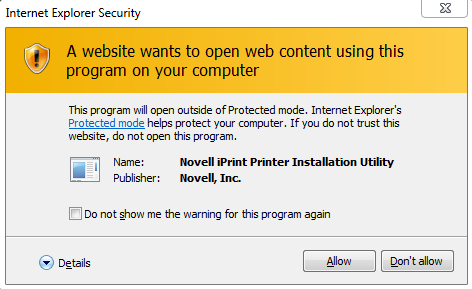 (Optional) To avoid future prompts to launch the OES iPrint applications, select the Do not show me the warning for this program again check box.