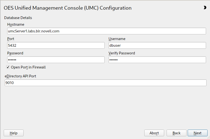 UMC ships with PostgresSQL by default. The database port number is 5432 and eDirectory API port is 9010 by default and can be modified if necessary.